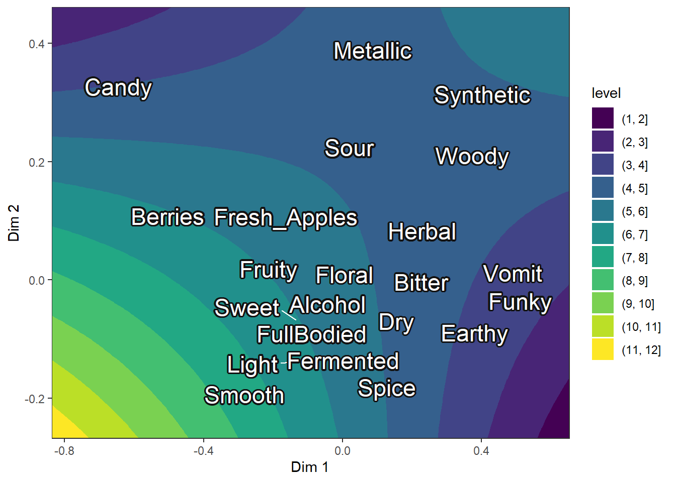 geom_contour_filled(aes(x = Dim.1, y = Dim.2, z = Liking, fill = after_stat(level)),